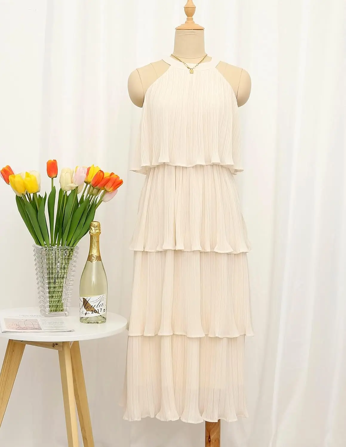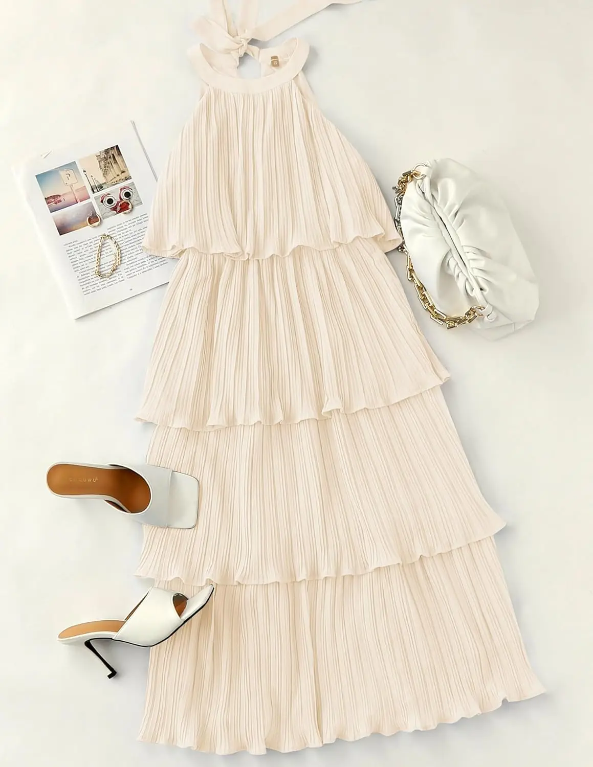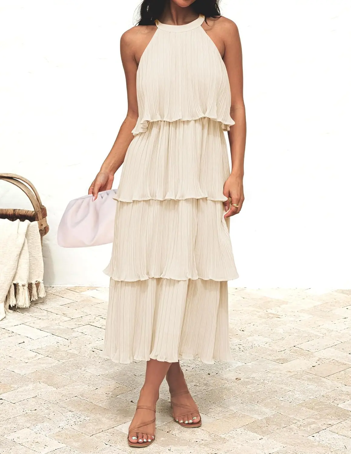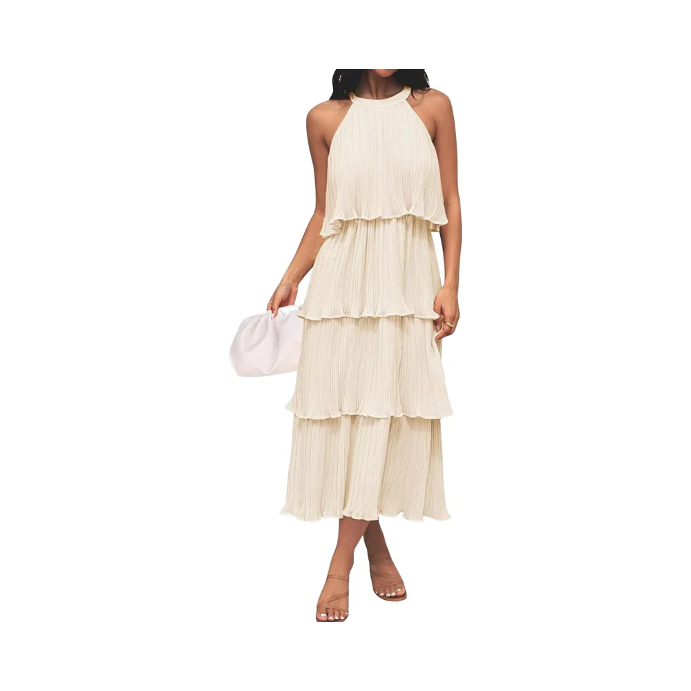Women's Casual Summer Sleeveless Halter Neck Ruffle Tiered Chiffon Swing Long Midi Dress Solid Natural Digital Pattern